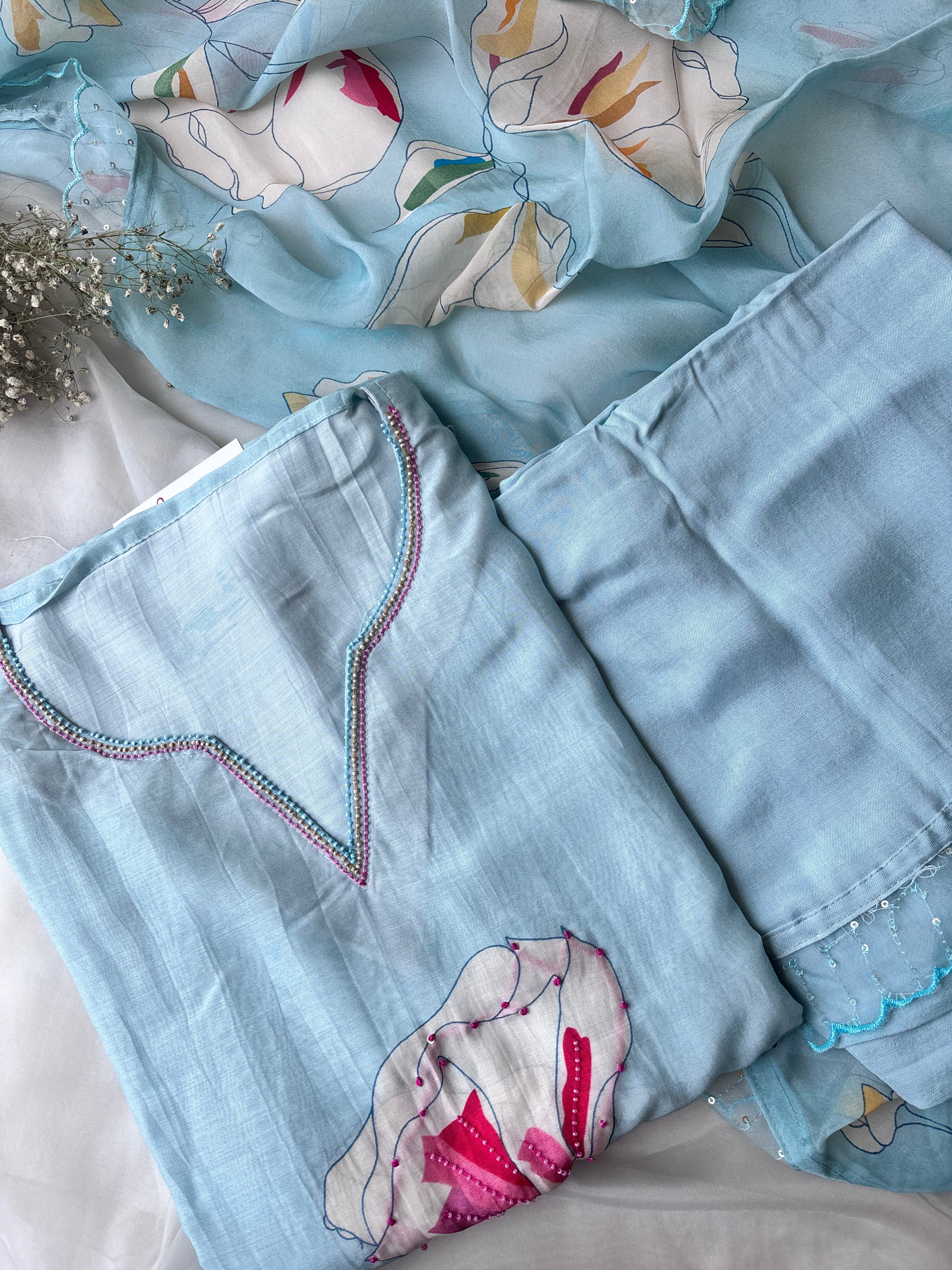 Sky blue Pure Muslin Semi Stitched Salwar with Soft Organza Dupatta
