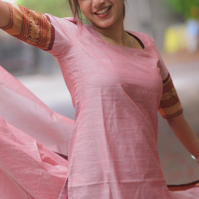 Expertly crafted with pure kanchi cotton, the Pink Meenakshi set features a stunning pink and maroon border design on the top and duppata. Experience the softness and elegance of kanchi cotton while making a statement with this timeless set.