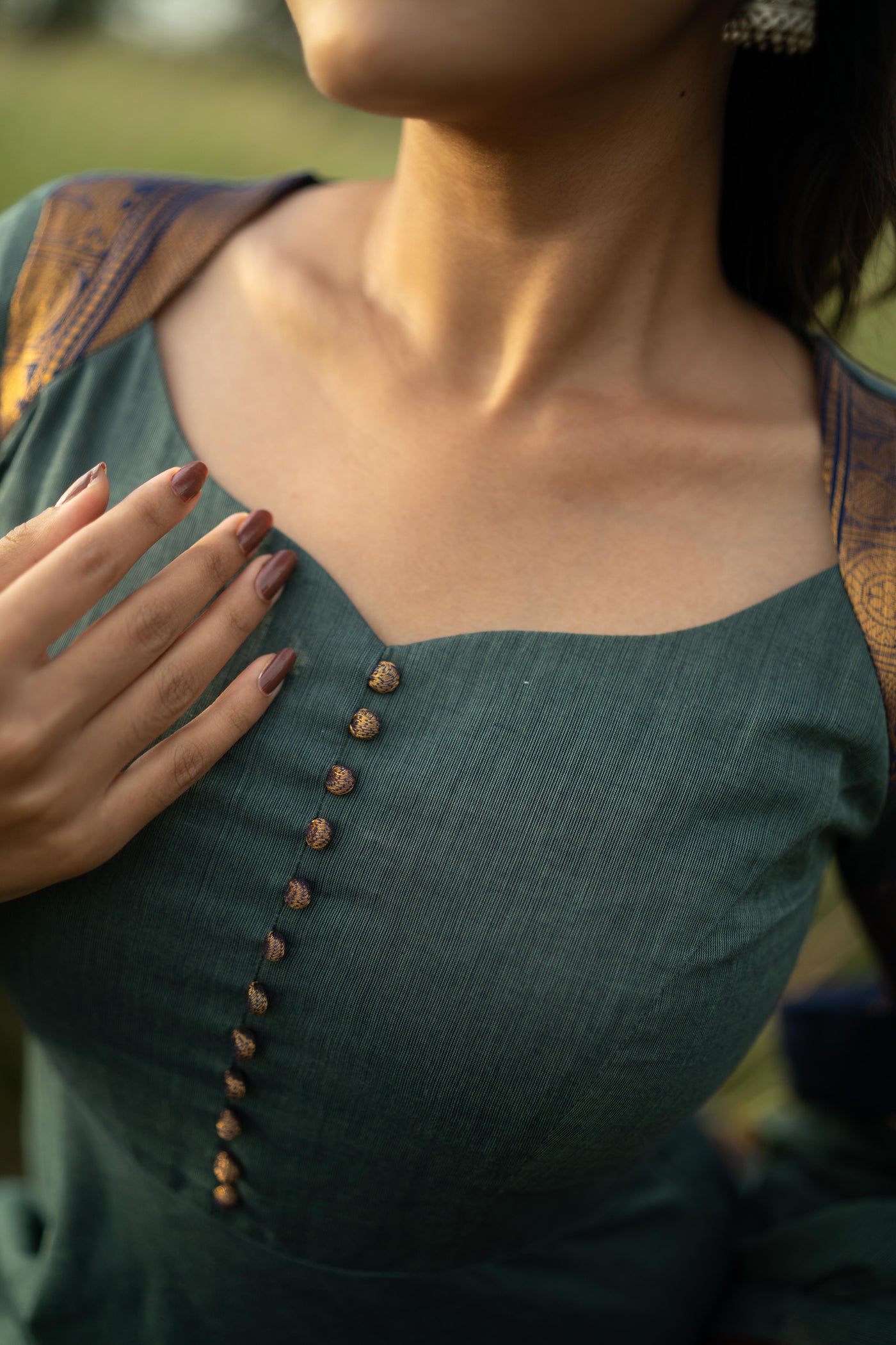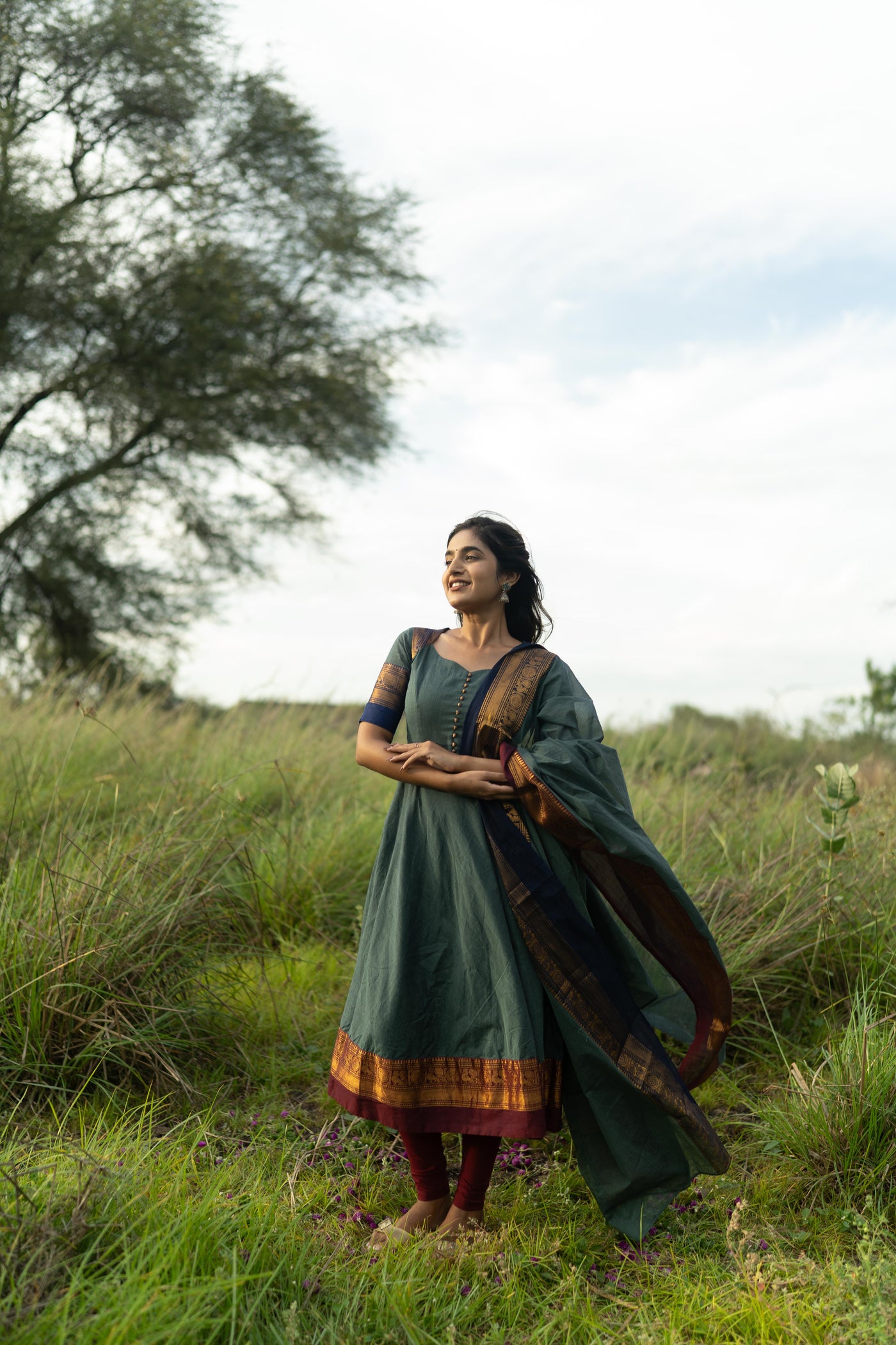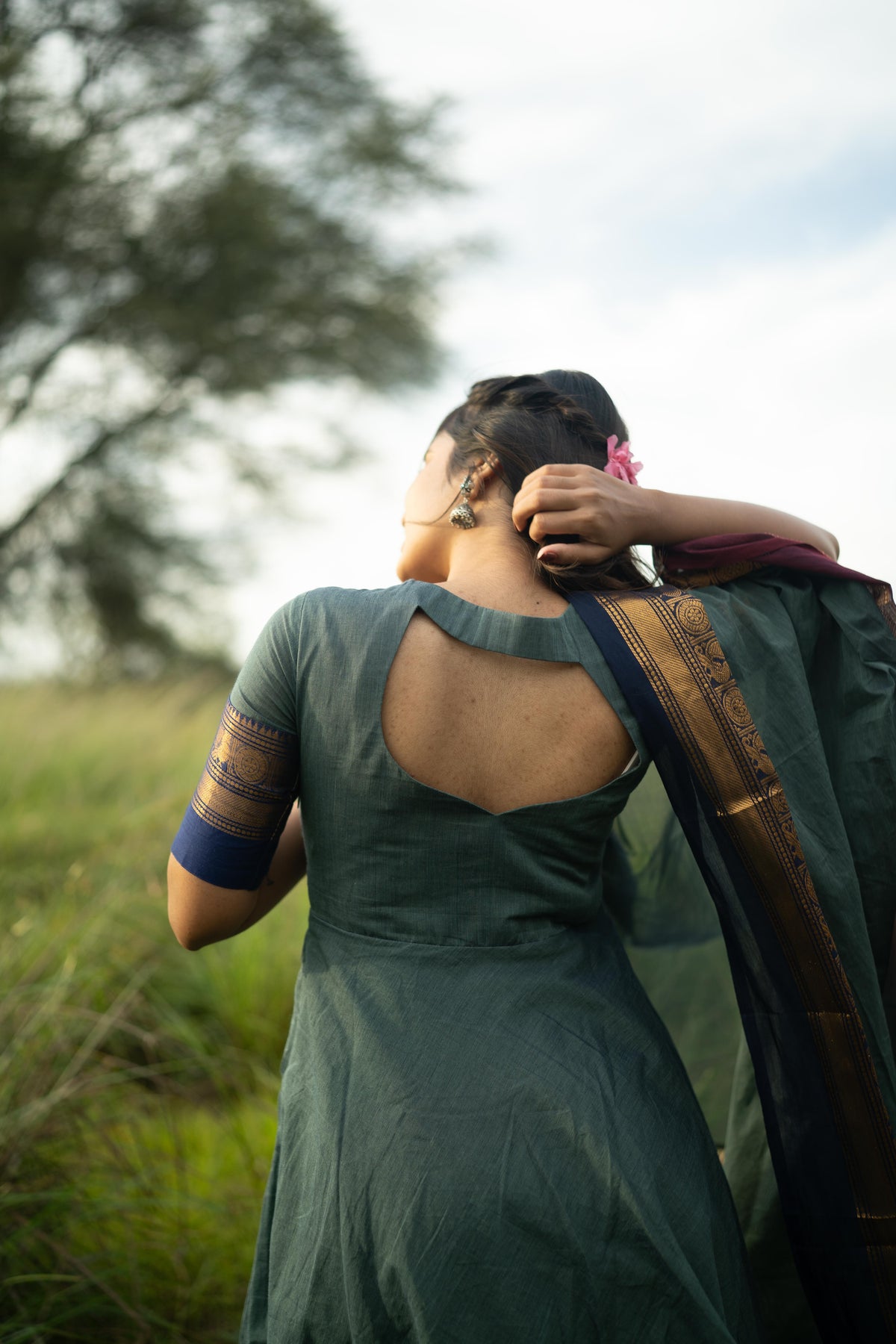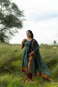 Blue with Maroon & blue Border Kanchi Cotton with potli balls Top & Dupatta