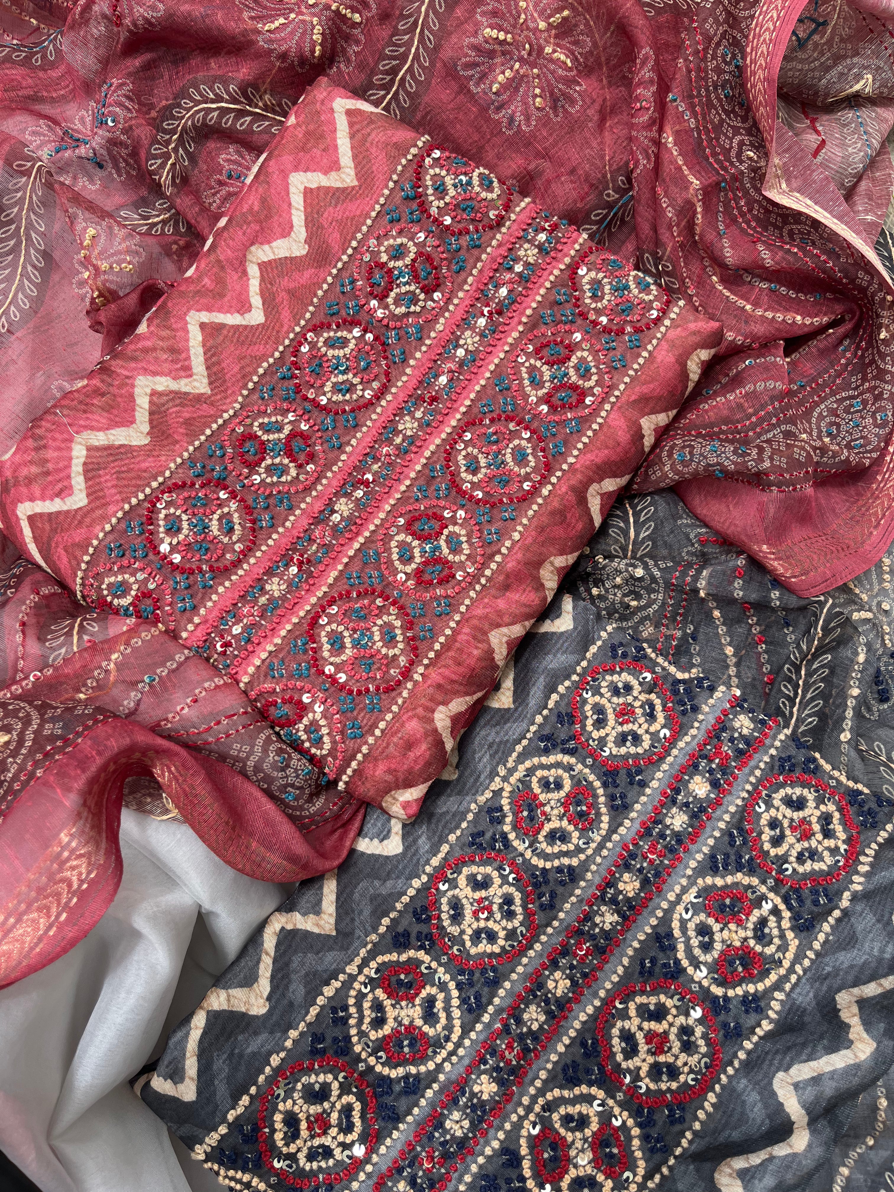 Dark Grey & Wine color Chanderi Unstitched salwar set