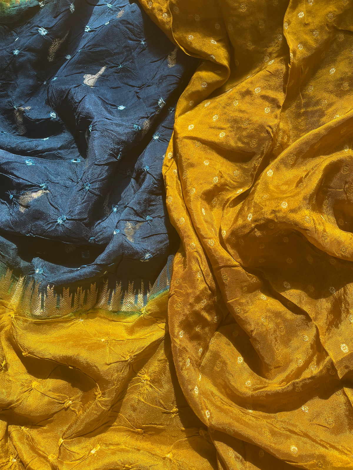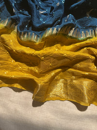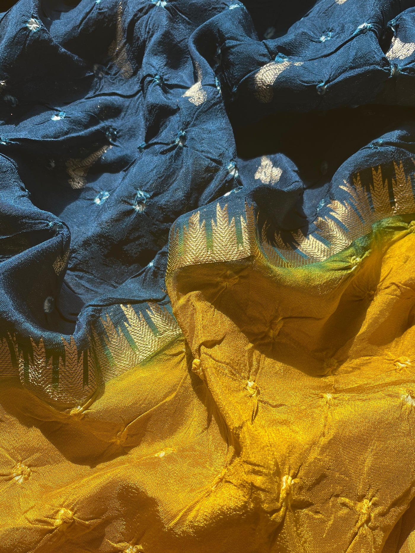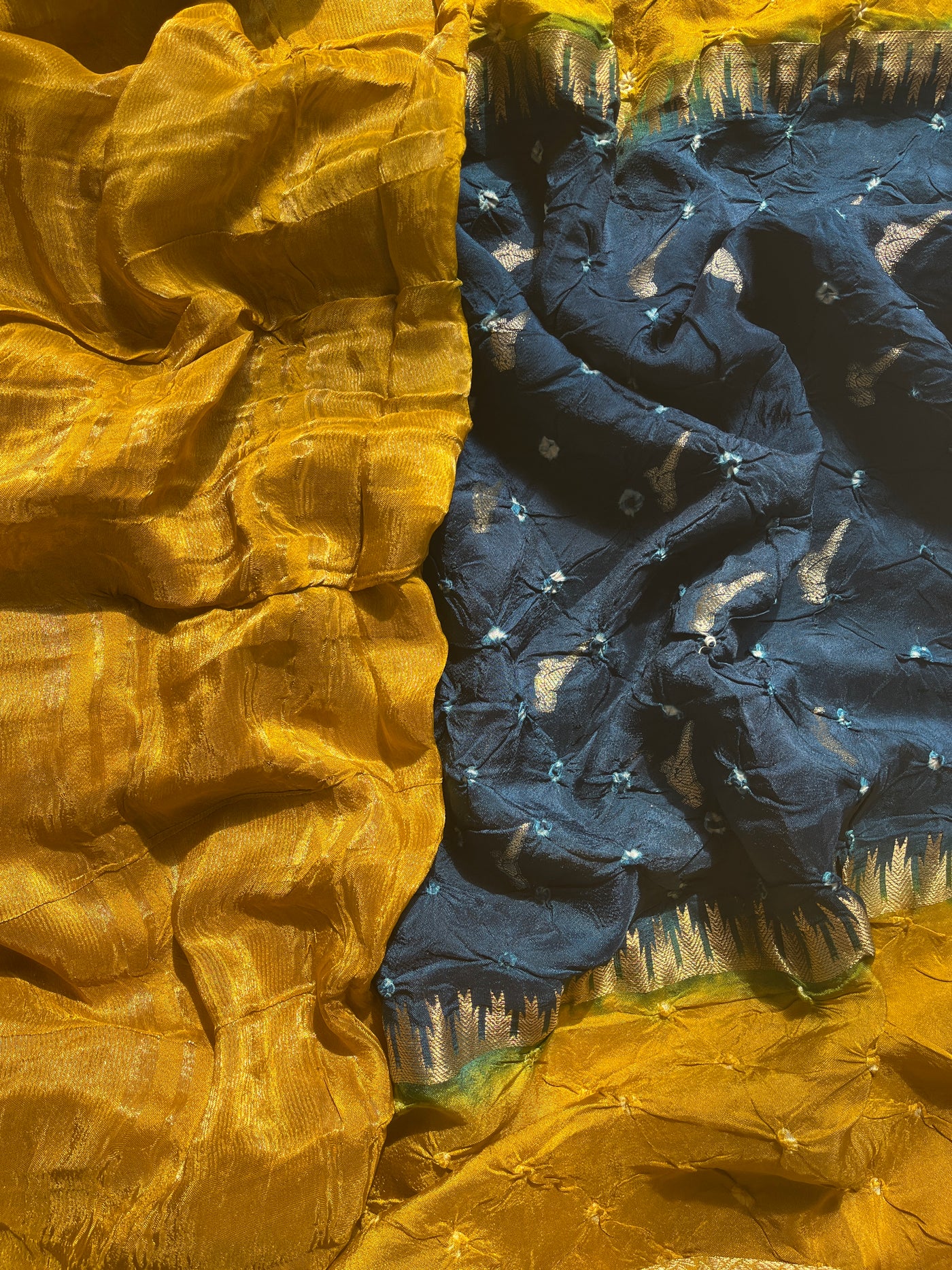 Elevate your traditional wardrobe with this Blue with Mustard Bandhini Art Silk Saree. Crafted from premium art silk, it features intricate Bandhini patterns in mustard that add a vibrant contrast against the deep blue fabric. Lightweight yet richly textured, this saree offers both comfort and elegance, making it ideal for festive occasions or formal events. Its timeless design reflects expert craftsmanship, ensuring you stand out with subtle sophistication.
