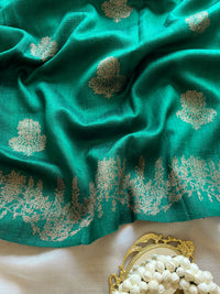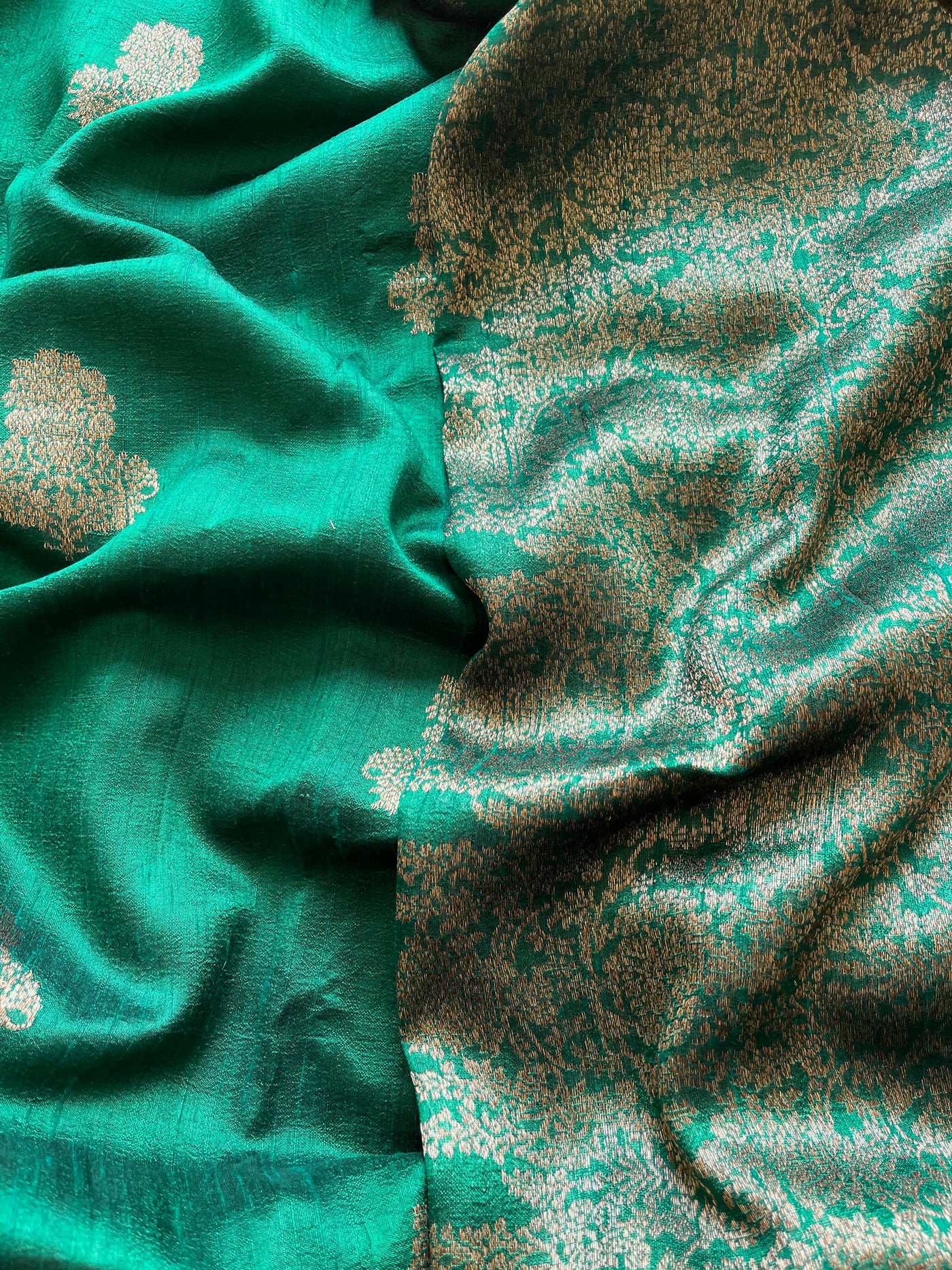 The Bottle Green Kora Raw Silk Saree embodies timeless elegance with its rich, deep green shade and the unique texture of Kora silk. This saree’s raw silk fabric offers a crisp, refined drape while ensuring comfort and durability, making it ideal for formal occasions and traditional celebrations. Expertly crafted, it balances classic charm with modern sophistication to enhance your ethnic wardrobe.