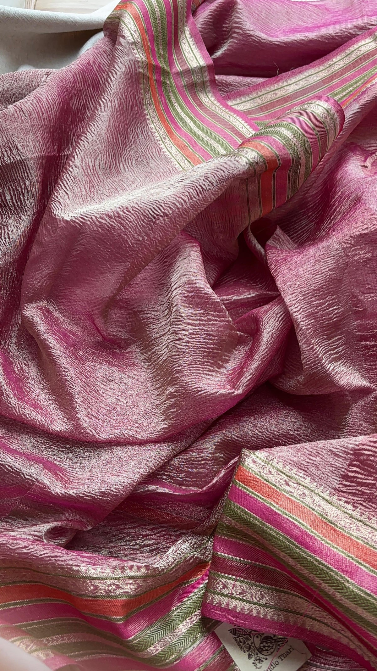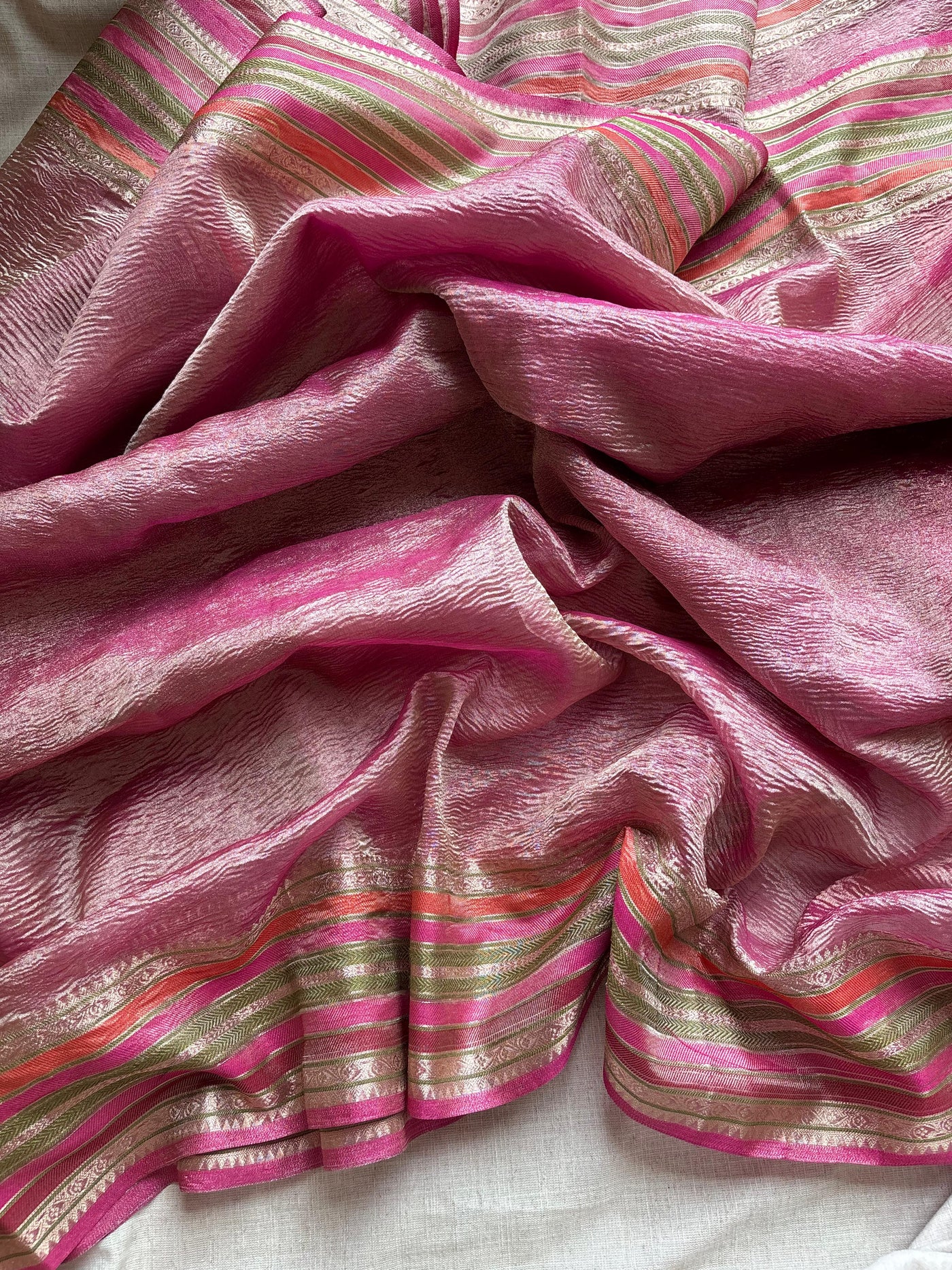 Elevate your ethnic wardrobe with the Onion Pink Crushed Tissue Saree, crafted for a refined and graceful look. Its lightweight crushed tissue fabric ensures comfortable draping and an elegant fall, while the soft onion pink hue adds subtle sophistication. Perfect for formal occasions or festive events, this saree combines traditional charm with contemporary style for a timeless appeal.