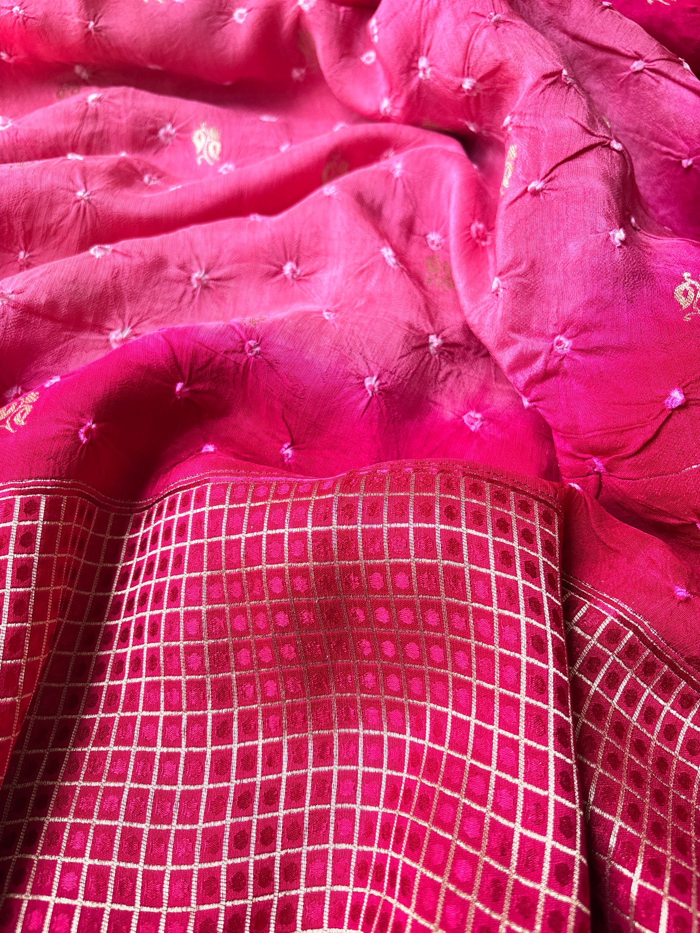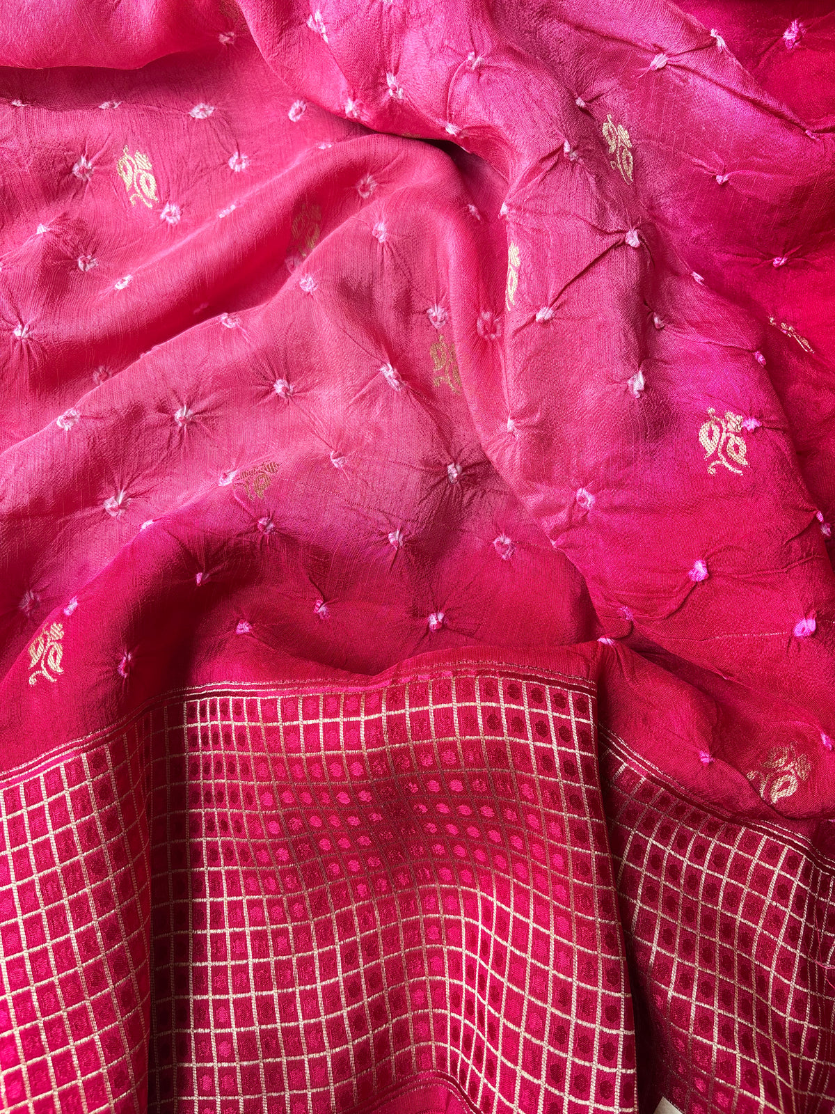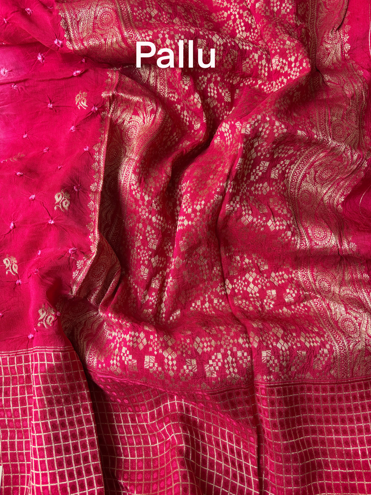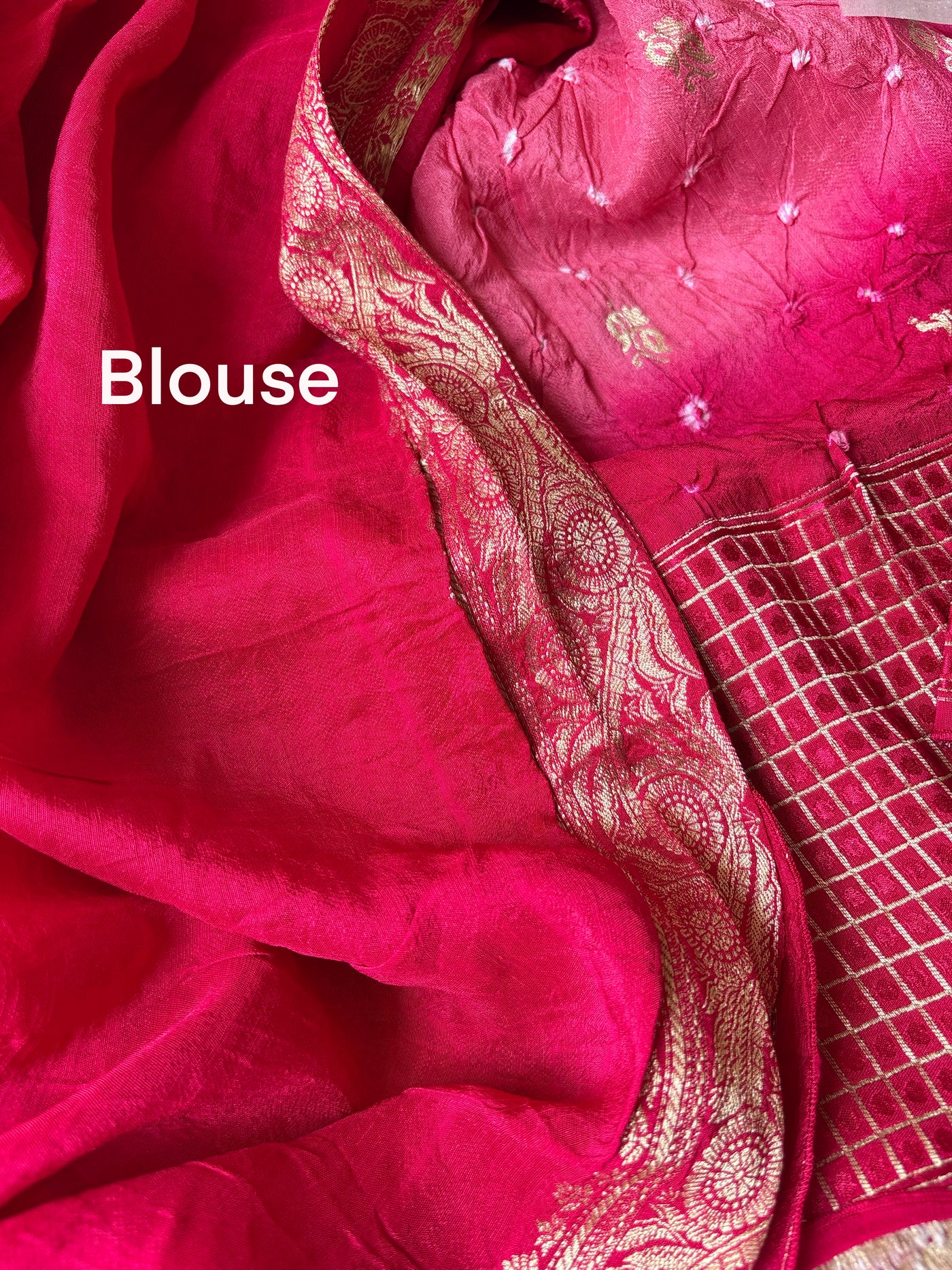 This stunning Pink with Red Bandhini Saree features a beautiful blend of vibrant colors, perfect for any occasion. Made with high-quality materials, it offers a comfortable fit and elegant drape. Its classic bandhini pattern adds a touch of traditional charm to your look. Elevate your style with this timeless saree.