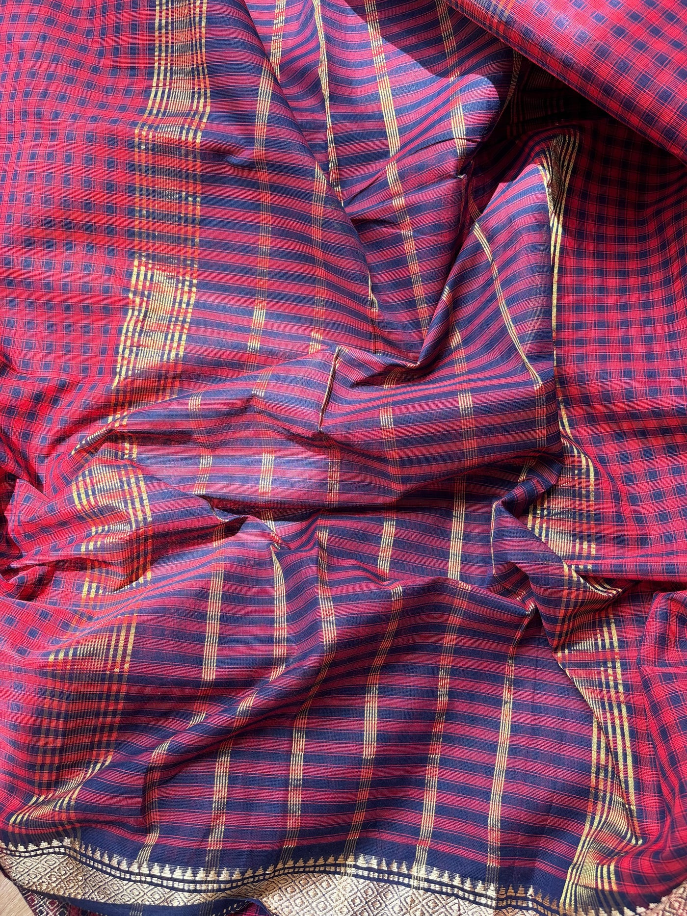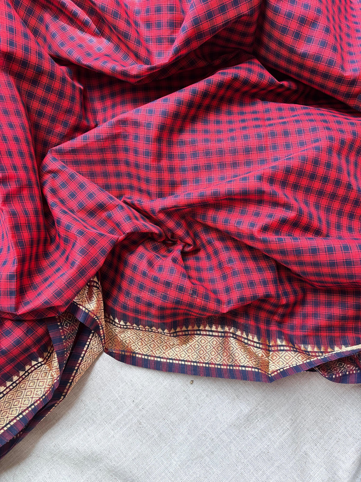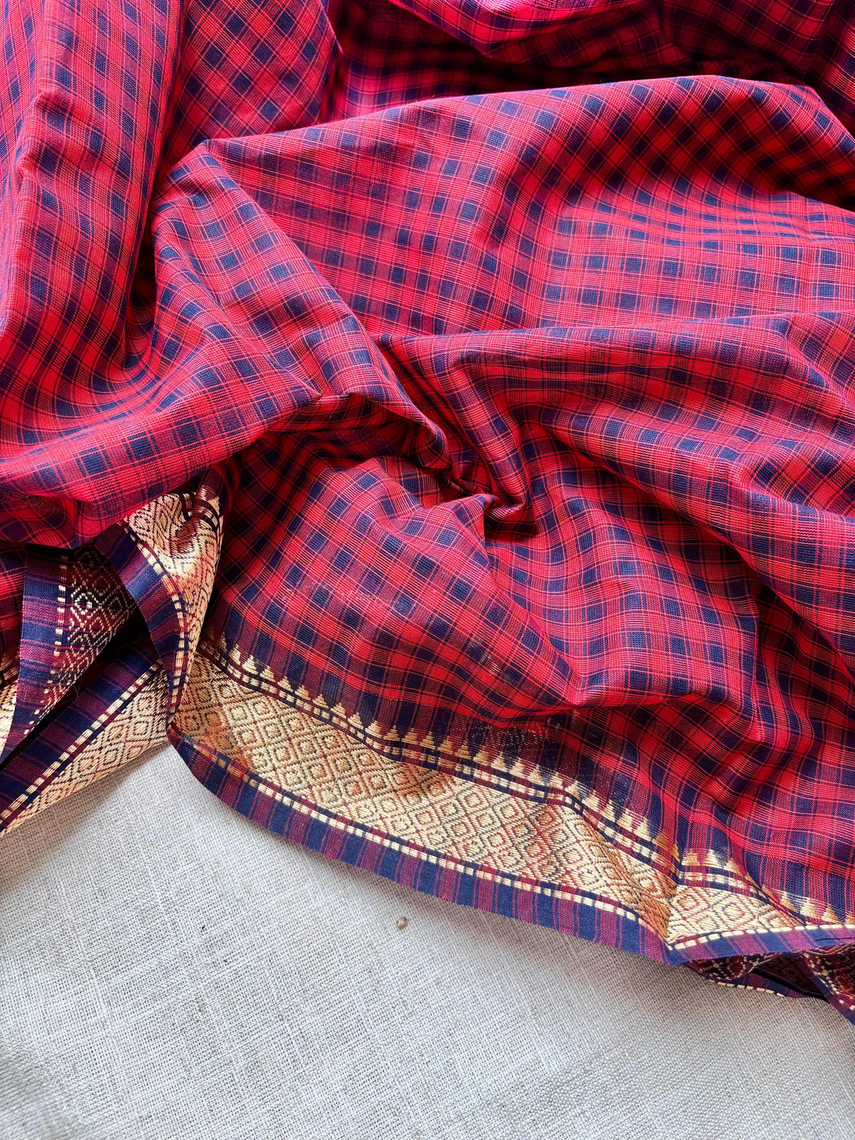 This Pure Chettinad saree features a timeless blend of red and navy blue arranged in classic Madras checks, embodying traditional craftsmanship and cultural heritage. Woven with care, it offers a rich texture and vibrant color contrast, making it an elegant choice for festive occasions and formal events. The breathable fabric ensures comfort, while the distinctive pattern adds a sophisticated touch to your wardrobe. Ideal for those who appreciate authenticity and style rooted in South Indian weaving traditions.