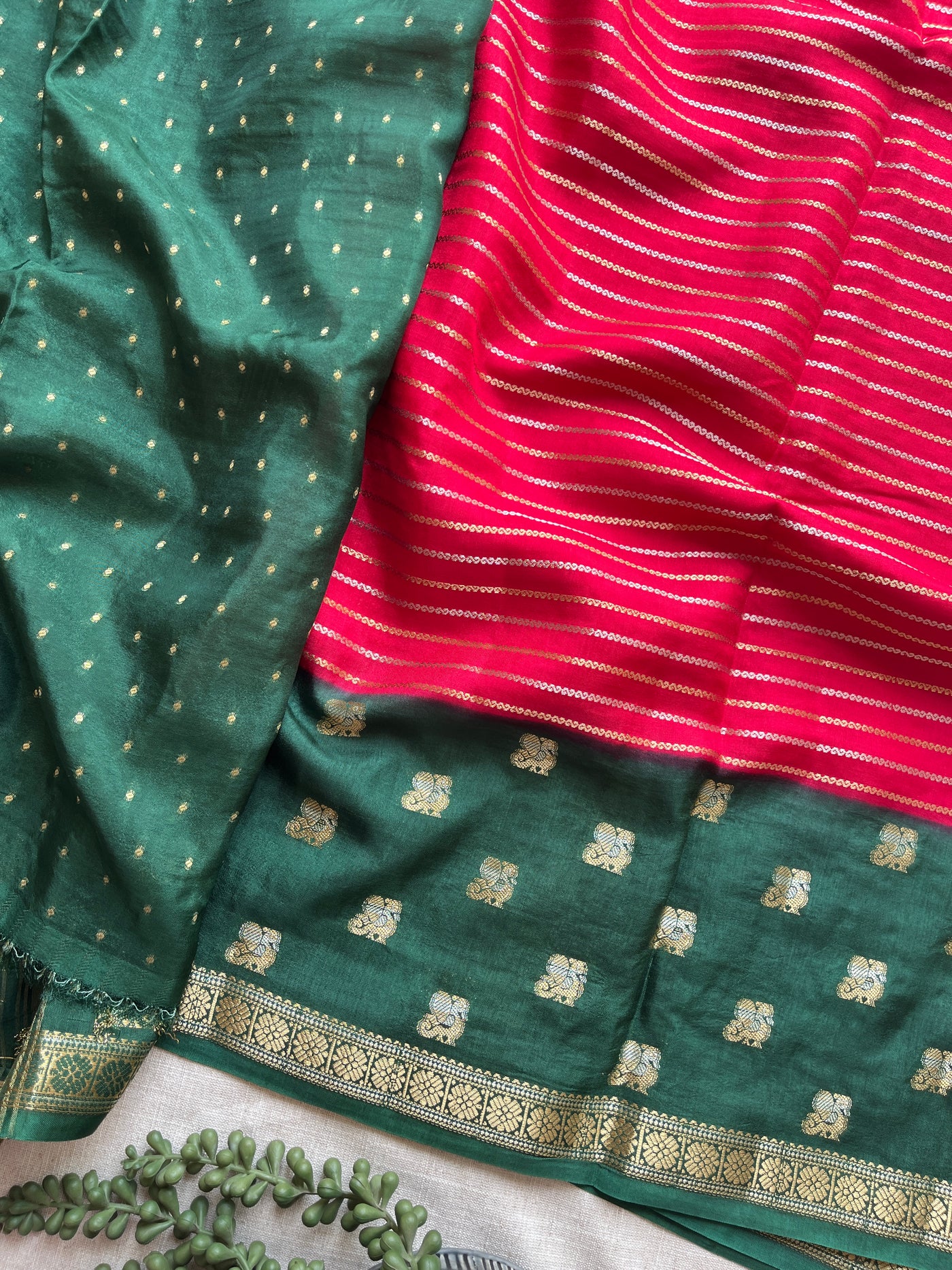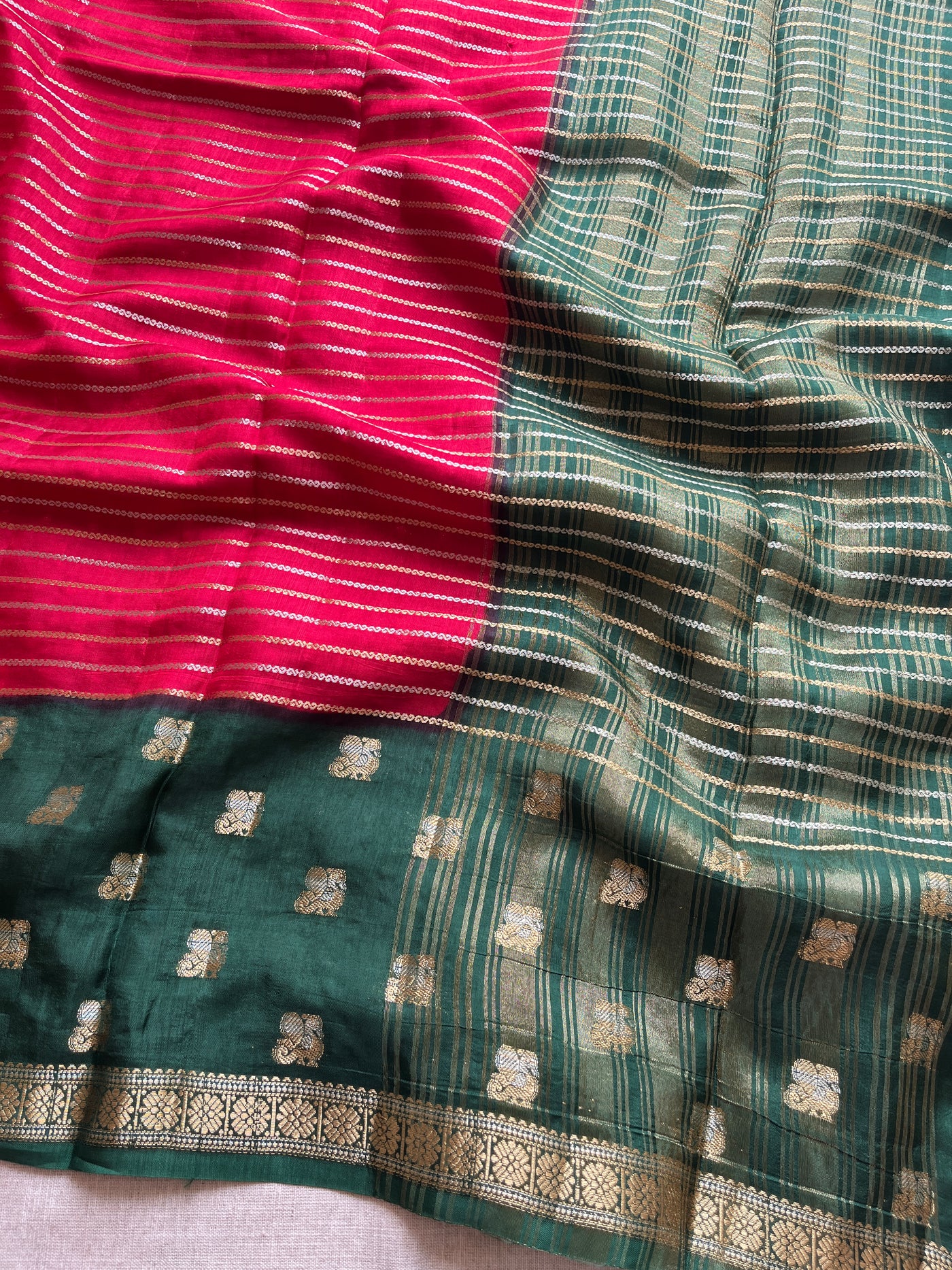 Elevate your traditional wardrobe with this Red and Dark Green Viscose Silk Saree, expertly crafted for a refined aesthetic. The viscose silk fabric offers a smooth texture and subtle sheen, ensuring comfort and grace throughout the day. Its rich red base paired with contrasting dark green accents creates a sophisticated palette ideal for festive and formal occasions. This saree is designed to drape effortlessly, enhancing your silhouette with an elegant fall and luxurious feel.