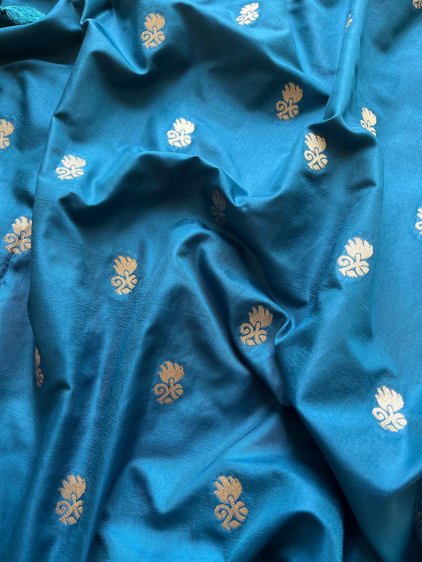 Experience the serene elegance of this Blue Banarasi semi-silk saree, a refined creation rooted in centuries of Varanasi weaving excellence. Woven from premium semi-silk fabric, it combines a soft, luxurious texture with a subtle luminous finish that enhances the deep blue tone. The sophisticated colour palette suits a wide range of occasions, from intimate gatherings to grand celebrations. Authentic Banarasi craftsmanship ensures intricate detailing and superior quality that withstands time. This saree represents the perfect marriage of traditional artistry and contemporary aesthetics, ideal for discerning wearers who appreciate genuine heritage