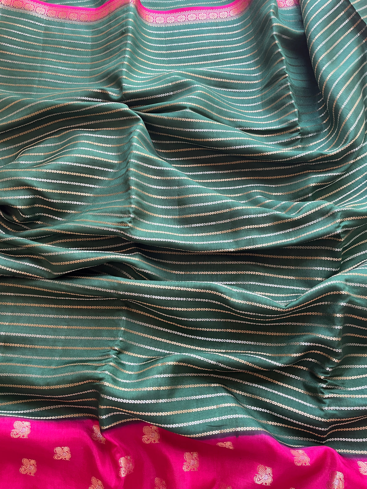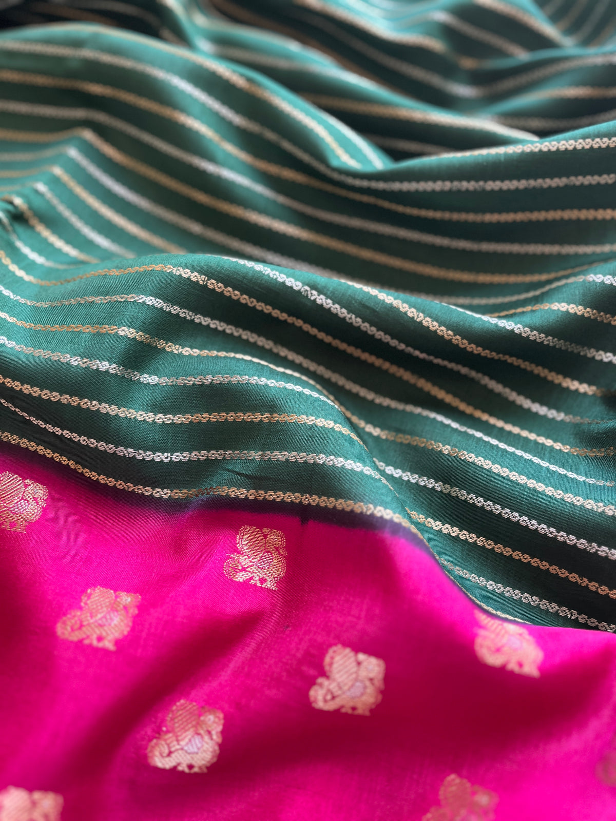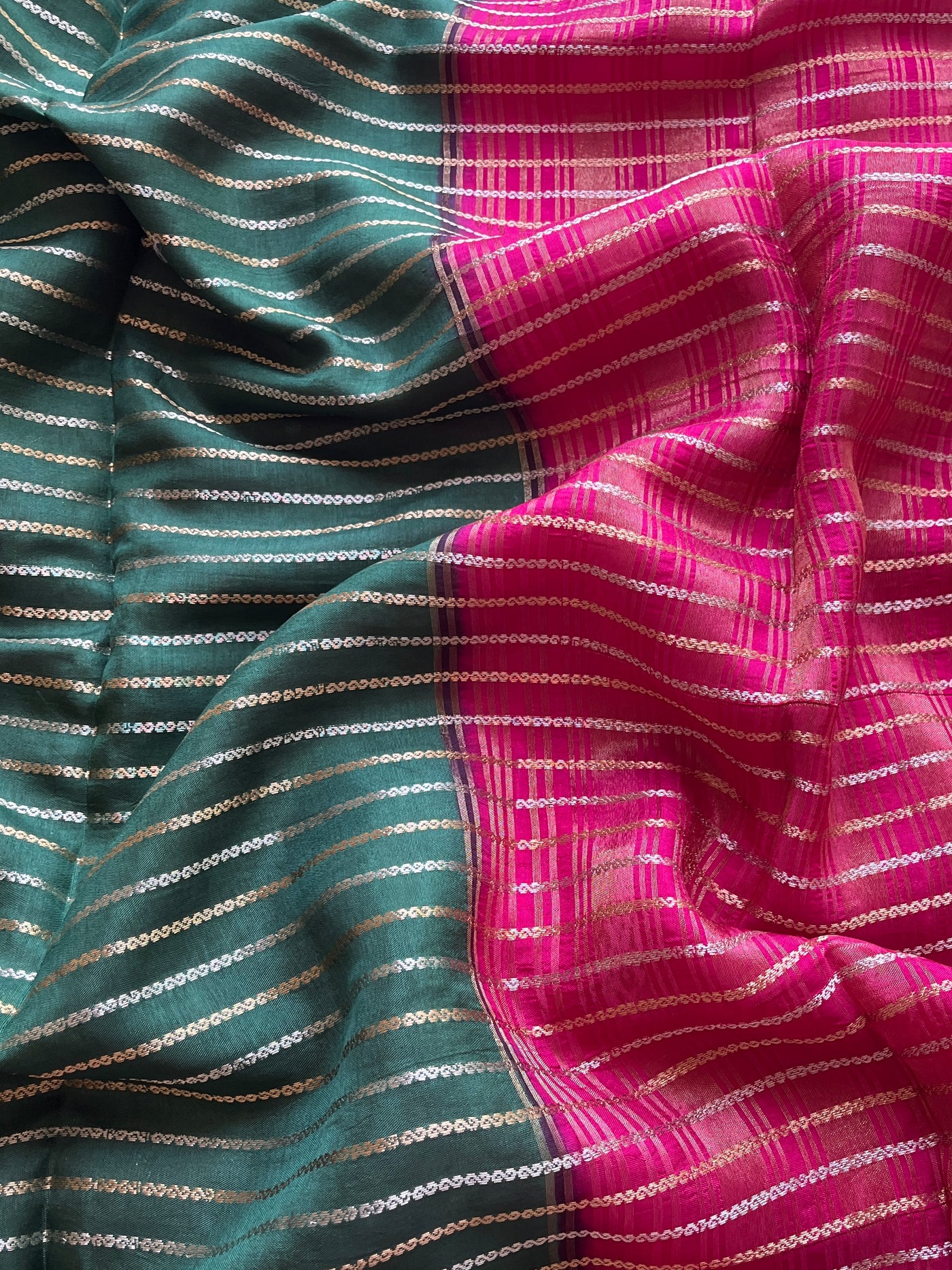 This striking viscose silk saree showcases a captivating interplay of emerald green and blush pink, creating a sophisticated color palette that stands out at any occasion. The premium viscose silk fabric offers a fluid drape and natural sheen, ensuring comfort throughout wear while maintaining an elegant silhouette. The harmonious color contrast adds depth and visual interest, making it versatile for both traditional ceremonies and contemporary celebrations. Ideal for those seeking a refined piece that balances classic aesthetics with modern sensibility.
