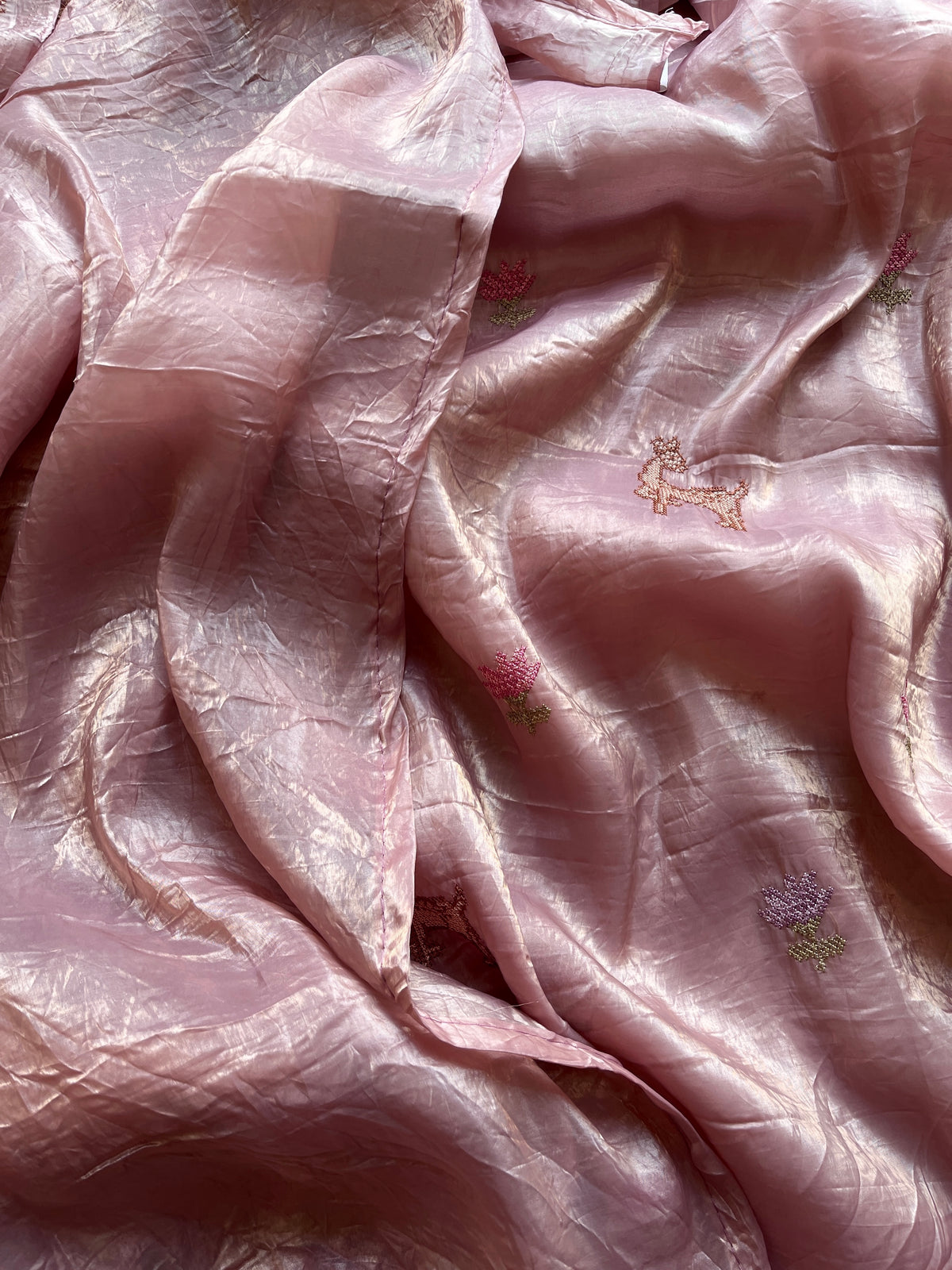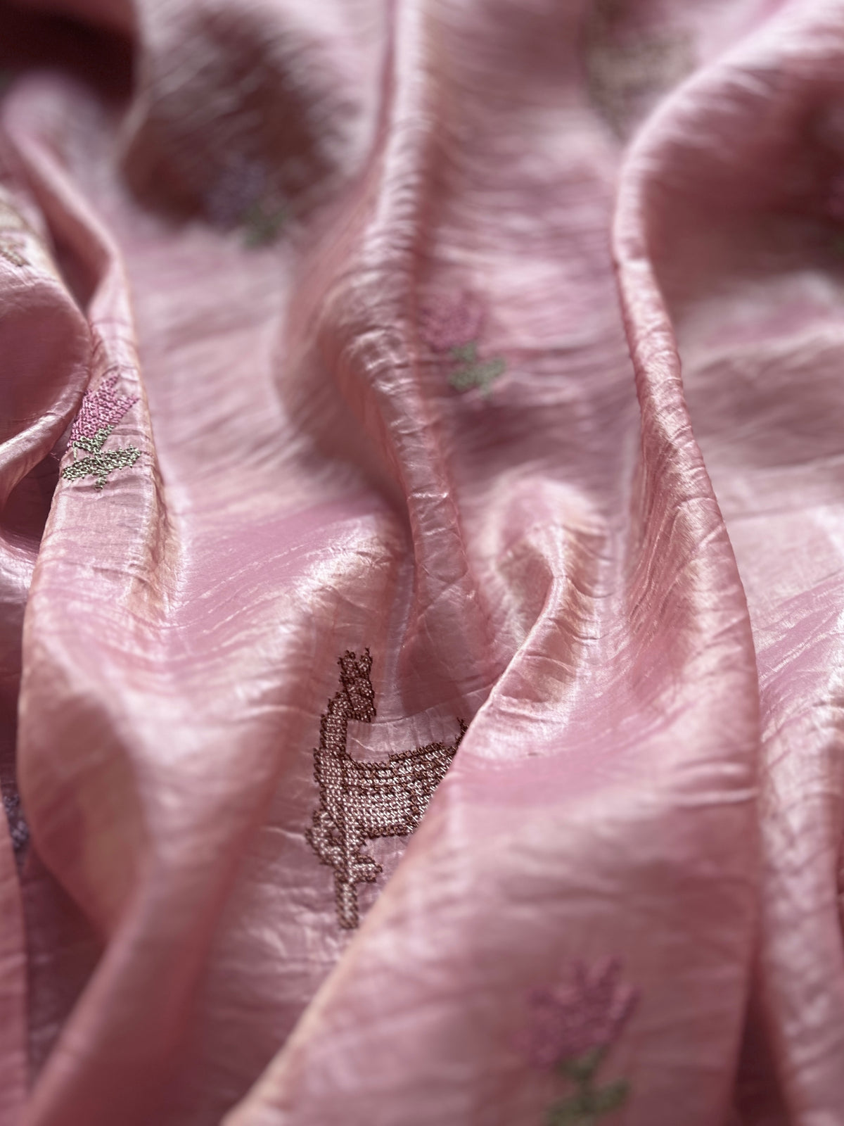 Drape yourself in timeless elegance with this Vintage Mauve Crushed Tissue saree. The soft mauve hue exudes sophistication, while the delicate crushed tissue fabric creates an ethereal, flowing silhouette that catches light beautifully. Perfect for festive occasions, weddings, or intimate celebrations, this saree combines traditional craftsmanship with understated luxury. The lightweight texture ensures comfort throughout the day, making it an ideal choice for warm climates. A versatile piece that pairs effortlessly with classic jewelry and traditional styling, this saree is a testament to refined taste and enduring style.