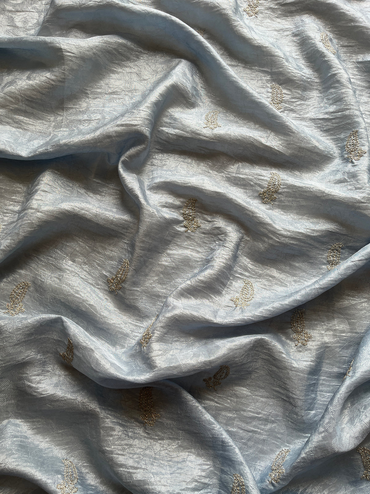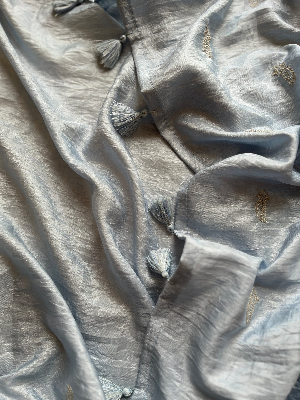 Elevate your ethnic wardrobe with this exquisite powder blue tissue saree, a masterpiece of refined elegance. Crafted from premium tissue fabric, this saree offers a luxurious drape that gracefully complements your silhouette while maintaining a feather-light comfort. The delicate powder blue hue exudes sophistication, making it an ideal choice for festive occasions, celebrations, and formal gatherings. The tissue weave ensures breathability and ease of movement, while its subtle sheen adds an understated glamour. Perfect for those who appreciate timeless design paired with contemporary sensibility, this saree seamlessly transitions from traditional events to modern celebrations.