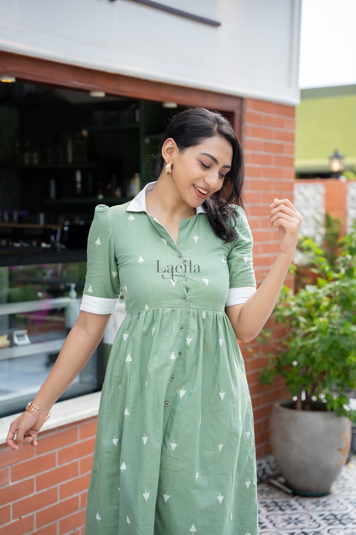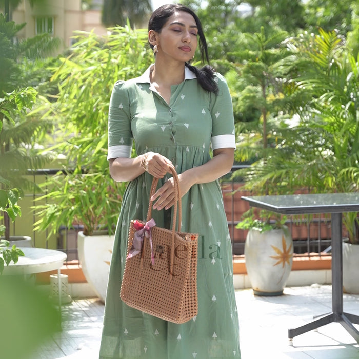 Elevate your wardrobe with our Pastel Green Kanchi Cotton knee length gown. Made with high-quality cotton, this gown exudes elegance and sophistication. Designed to flatter any figure, this gown is perfect for any occasion. Get ready to turn heads with our Pastel Green Kanchi Cotton knee length gown.