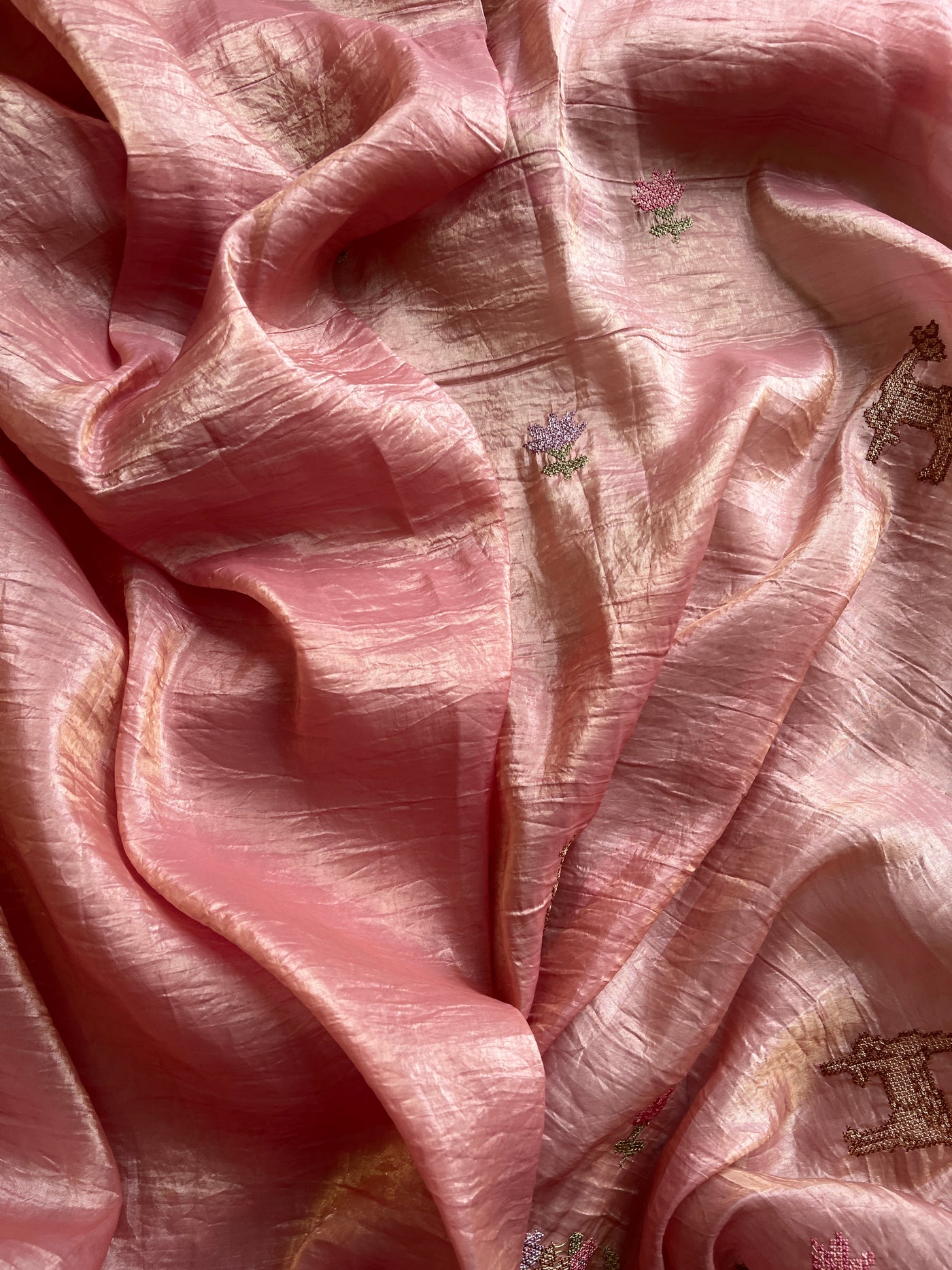 Drape yourself in ethereal elegance with this Peach Crushed Tissue saree, a masterpiece that celebrates refined simplicity. The delicate crushed tissue fabric creates a distinctive textured surface that catches light beautifully, offering movement and dimension with every step. The soft peach hue brings warmth and sophistication, making it versatile for both festive occasions and intimate celebrations. The natural crinkled finish of crushed tissue eliminates the need for excessive starching, allowing the saree to flow gracefully while maintaining its structured appeal. Perfect for those who appreciate understated luxury and contemporary draping aesthetics.