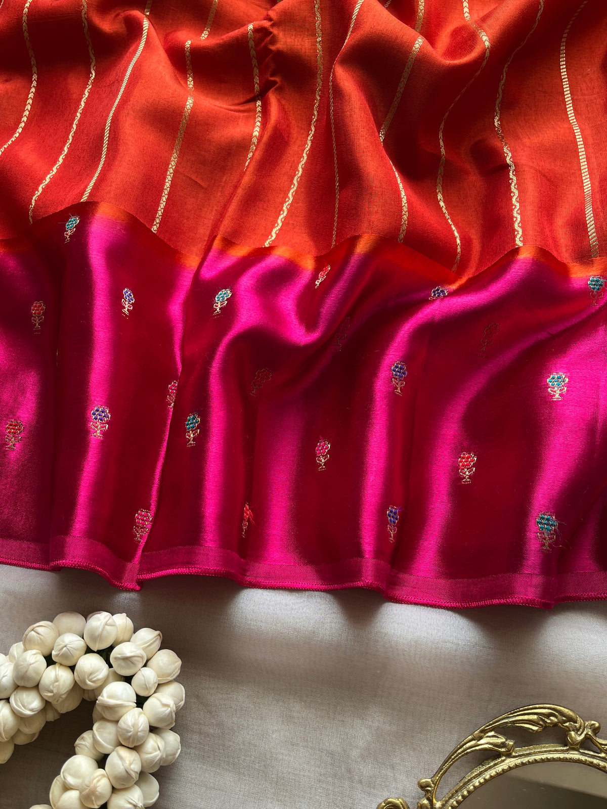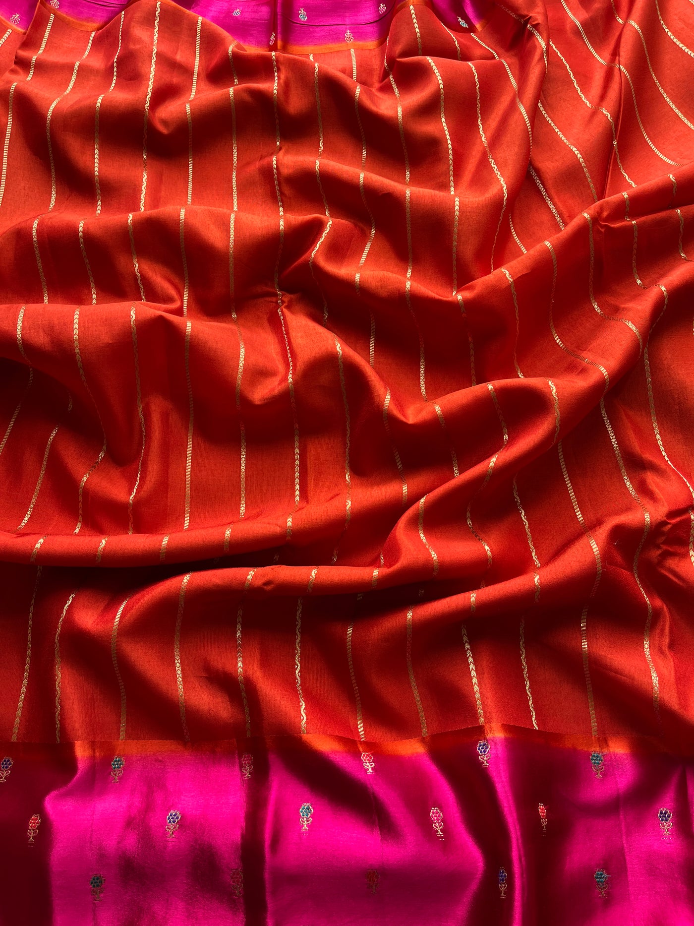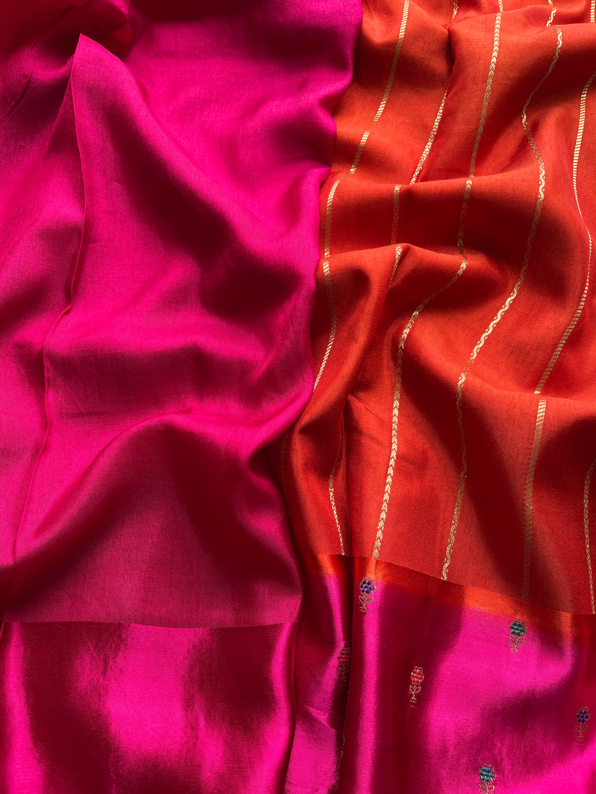 This Rust Orange Viscose Satin Saree, featuring a delicate pink border, blends vibrant hues with a silky smooth texture. Its lightweight fabric ensures graceful draping and comfortable wear, perfect for festive occasions or formal gatherings. The contrasting border adds visual interest, enhancing the saree’s elegant appeal for a sophisticated look.