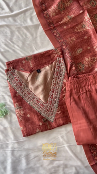 Uppada silk kurta Set with embroidered V neckline Shatoon stitched pant Uppada silk duppata(RUST)