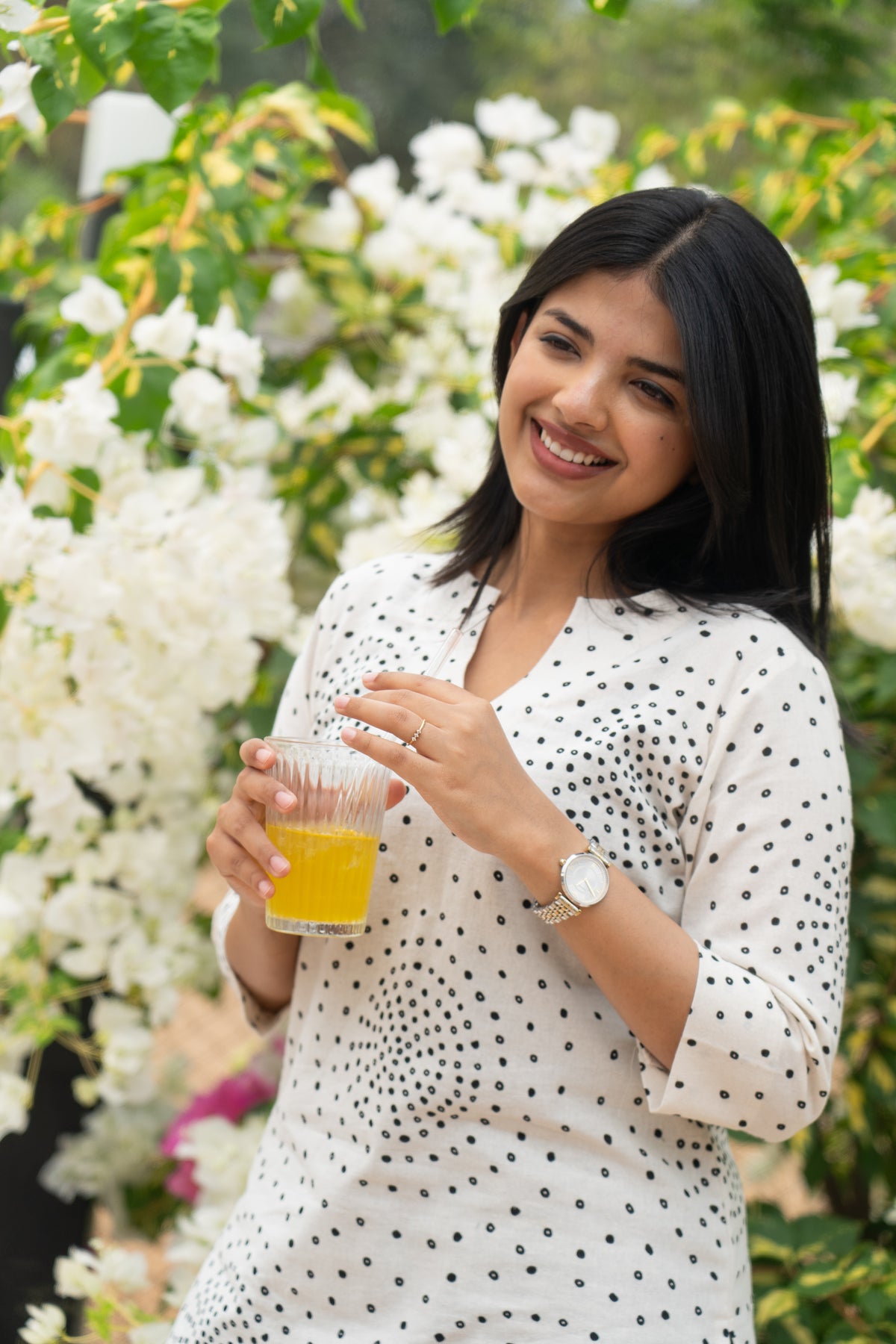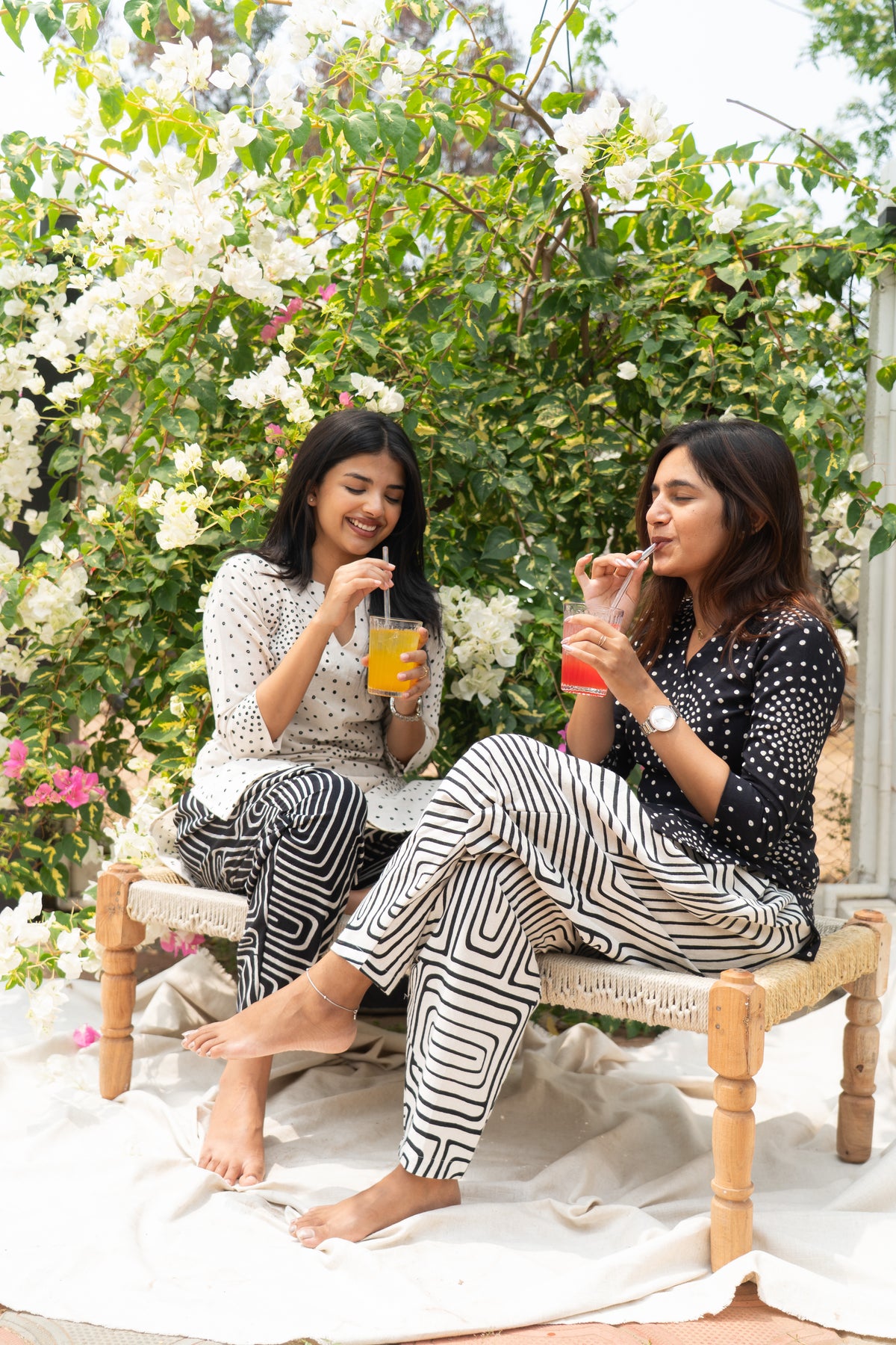 Elegant white polka short top paired with black patterned trousers, crafted from premium organza fabric. This sophisticated ensemble features a lined top for comfort and structure. Perfect for festive occasions, celebrations, or elevated everyday wear.